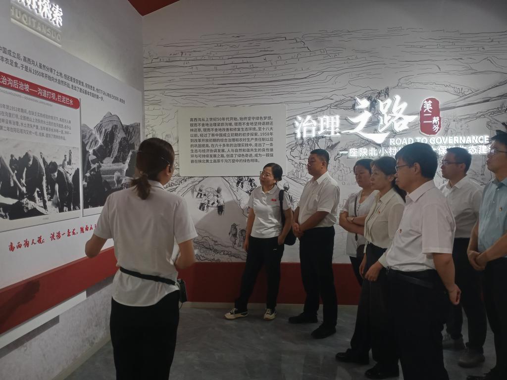 理论学习中心组一行先到米脂高西沟水土保持生态治理展览厅参观学习,走进厅里,通过千秋大计、治理之路、红的堡垒、再立新功四个篇章系统了解了高西沟村从“山上光秃秃、年年遭灾荒”到“层层梯田盘山头、片片林草盖坡洼”的变化历程,深刻体会到高西沟人民在高西沟党支部的带领下为美好生活做出的艰苦奋斗和不懈努力。