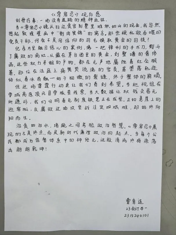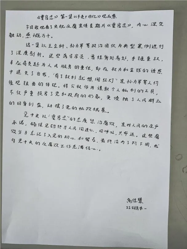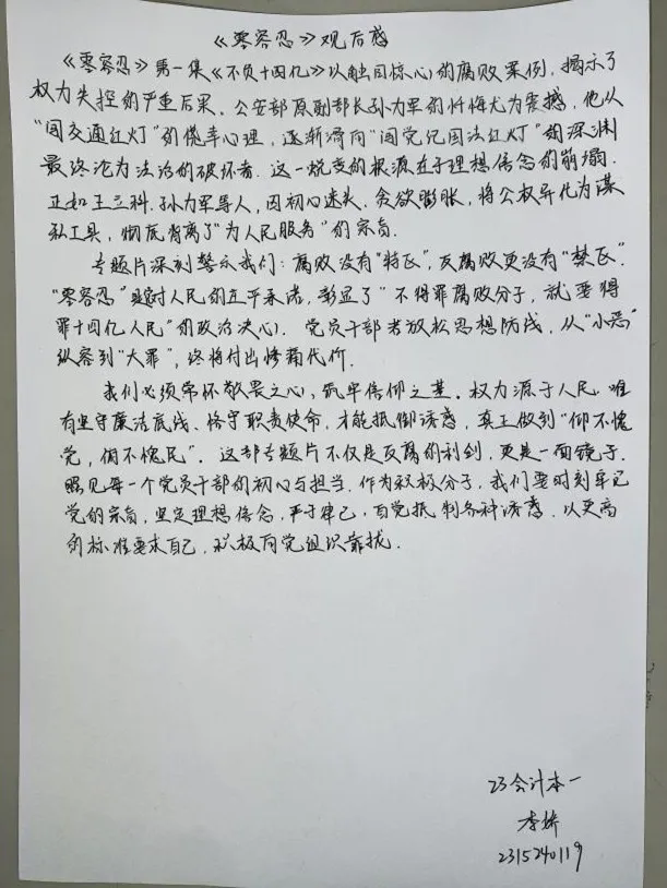 纪录片《零容忍》以真实案例为镜鉴,深刻揭露腐败对党和国家的危害,全面而深入地展现了党中央以零容忍态度推进全面从严治党的坚定决心和坚强意志。纪录片中的一个个鲜活的案例、一段段沉痛的忏悔,警示着每一位党员要时刻保持清醒头脑,严守纪律规矩,筑牢思想防线,做到忠诚干净担当。同时,它也为新时代党的建设注入了强大精神动力,激励着全党上下坚定不移地推进全面从严治党向纵深发展,持续巩固反腐败斗争成果,为实现中华民族伟大复兴的中国梦营造风清气正的政治生态和良好的社会环境,让清正廉洁成为党和国家政治生活的常态,确保党和国家的事业沿着正确的方向乘风破浪、行稳致远。
