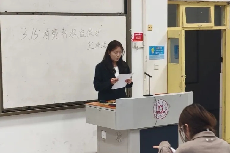 紧接着,员工代表贾文静上台发表了演讲。她以自己的亲身经历为例,分享了在消费过程中遇到的问题以及如何维护自己的权益。她的演讲内容丰富精彩,赢得了同学们的阵阵掌声。