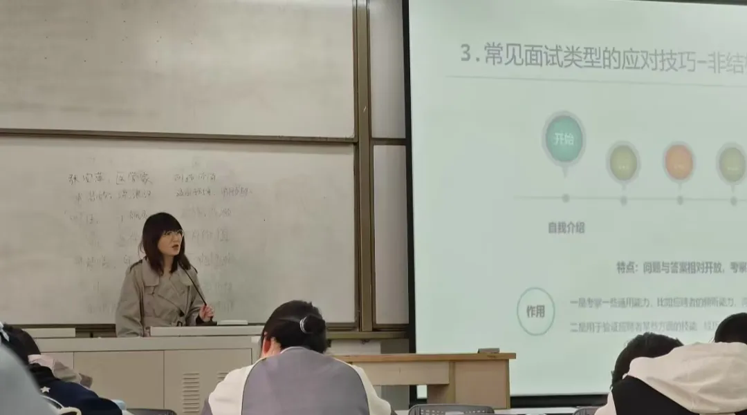 在互动环节,同学们积极提问,就职业规划、实习与就业的关系、跨行业求职等问题与嘉宾进行深入交流,老师耐心解答,为同学们提供了个性化的建议和指导,现场气氛十分活跃。此外,她特别提醒毕业生警惕“慢就业”陷阱,建议通过实习、行业调研提前积累资源,并推荐了多款职业测评工具助其自我诊断。