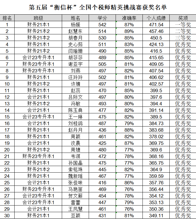 竞赛期间,选手每日上线答题,获得个人积分;参赛团队内的前30名的选手个人分数形成团队分,分别进行个人和团队的排行。经过14天的激烈角逐,公司优秀的选手们脱颖而出,斩获了一批优异的成绩和丰厚的奖励,4位导师为前30名选手颁奖,其中校内前三名为21财务本1班的杨媛、21财务本2班的赵慧东和胡春月,充分肯定了他们在个税师领域的卓越表现。