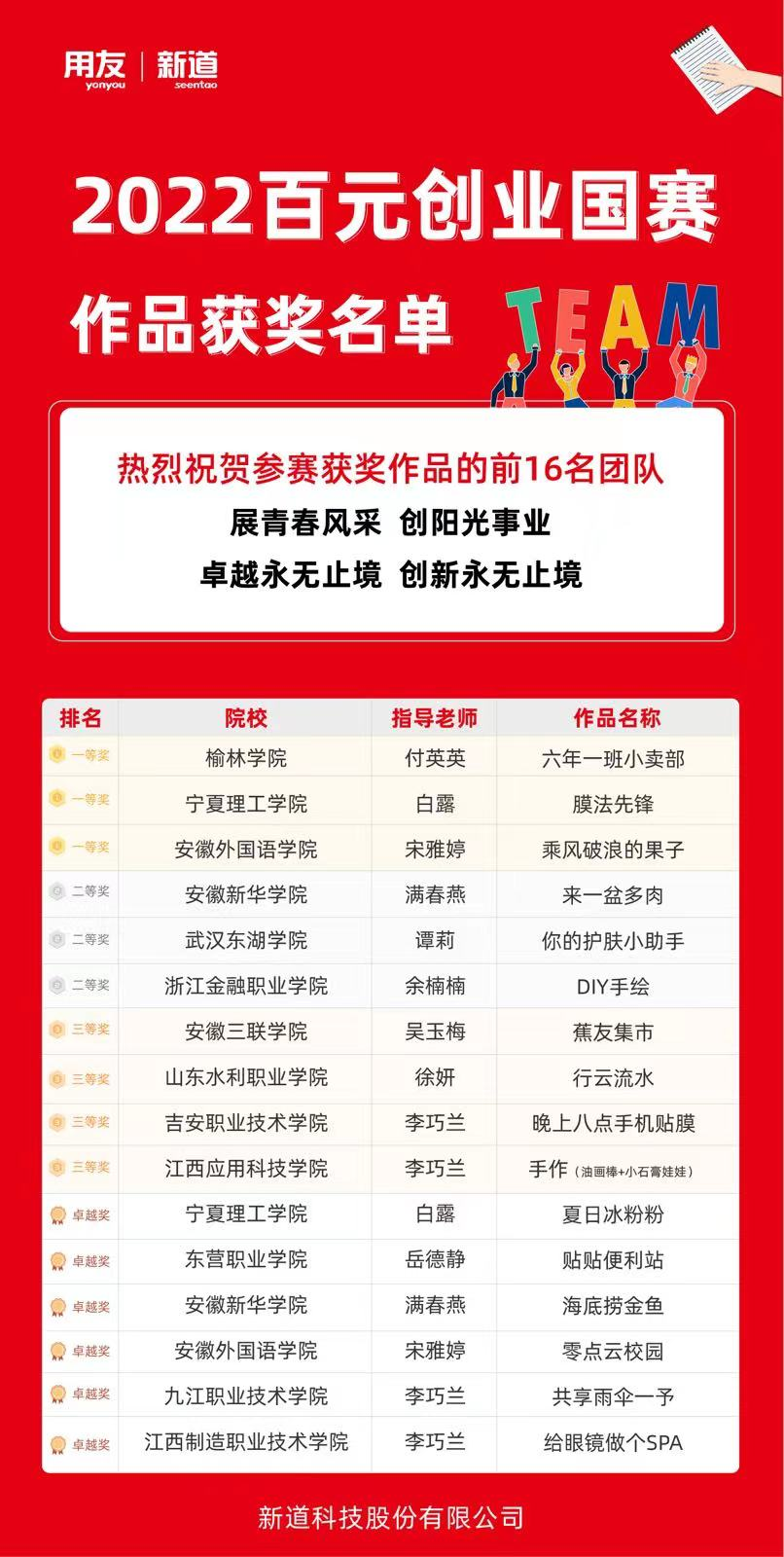 创业改变命运,行动成就梦想。为了给有新锐创业思想、优秀创业思维、高效能执行能力的优秀老员工提供一个挥洒创业激情,结交创业伙伴,提升创业技能的平台,展现创业才华和能力。2022年4月6日至5月30日,新道科技股份有限公司特联合多所高校举办创新创业活动“百元创业”大赛。