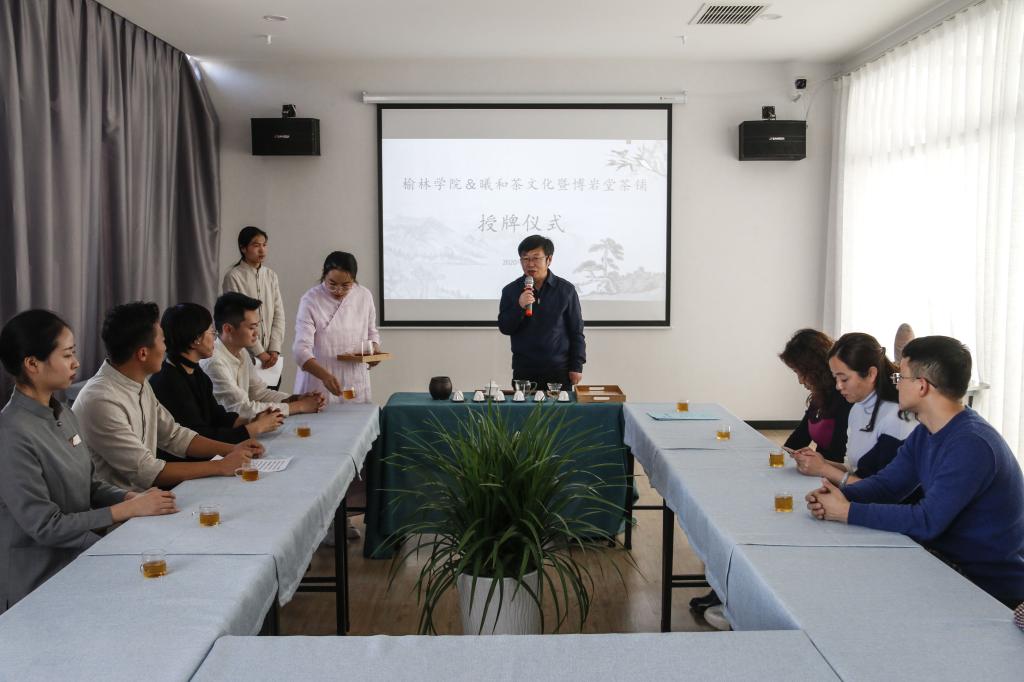 10月22日下午,英国365集团官网与榆林市曦和茶文化公司暨博岩堂茶铺签订实习基地协议并授牌。英国365集团官网经理高谋洲、副经理韩一敏、刘泽惠、副书记郝晓玫一行出席签约仪式并座谈。