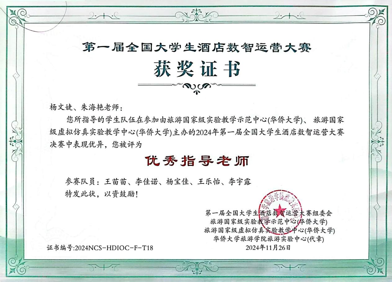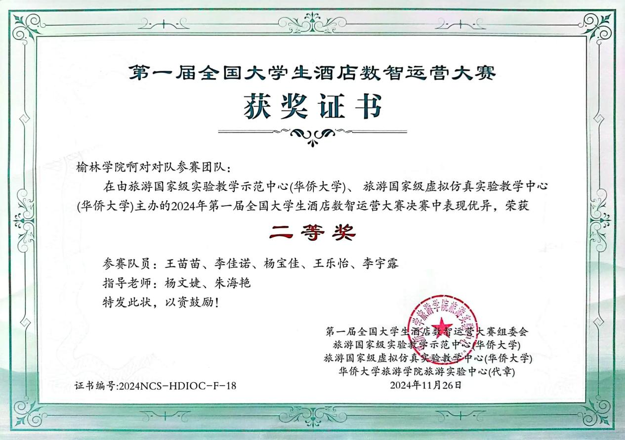 决赛阶段,在朱海艳、杨文婕老师的共同指导下,针对酒店运营中的实际问题,深入探讨酒店运营中的各个环节,通过大量的模拟实战、数据分析,不断地验证和优化方案,提升了实操能力。11月23日下午,校队伍以优异成绩在百所公司中脱颖而出,荣获本次大赛二等奖。